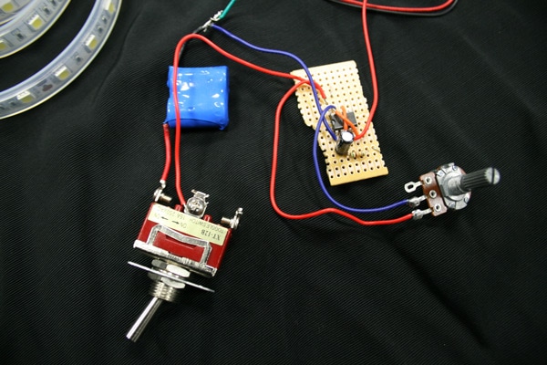 I replaced a 4.7KΩ resistor with a 50kΩ potentiometer, wired only two terminals to change it to a variable resistor, and plugged the battery back in. Further success! Using my aforementioned moderate soldering skills, I recreated the circuit on a perf board and added an SPST switch. Still amazed that the circuit worked, I placed everything except the LED strip in a project box and started photographing my successful build.