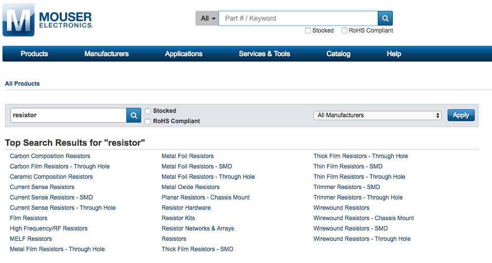 When you get to the point of designing your first project from scratch, after you’ve laid out the circuit it’s time to build the Bill of Materials (BOM). Naturally, you would go to mouser.com and start entering part names or numbers into the search bar. While you might be prepared to select the proper resistance value and/or power rating, what is probably less clear is the differences between the types of resistors and capacitors. Let’s take a look….
