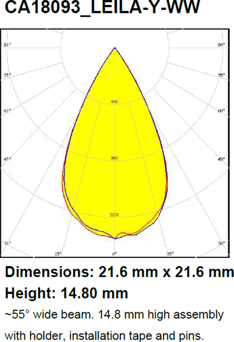 Ledil LEILA-Y Ø21.6mm LED Lenses are ideal for general, wall-wash, and sports lighting. The LEILA-Y Lenses are offered with symmetric and asymmetric beams. LEILA-Y Lenses feature a thin holder design and are backward compatible with previous LEILA generations. The wall-washing beam is designed to be used in groups to provide uniform illumination with a typical installation distance from the wall of 10cm to 20cm and an optimal luminaire spacing of 5cm to 15cm.The Ledil LEILA-Y Ø21.6mm LED Lenses are optimized for use with 3535 LED packages and are compatible with up to 5050 LED packages.